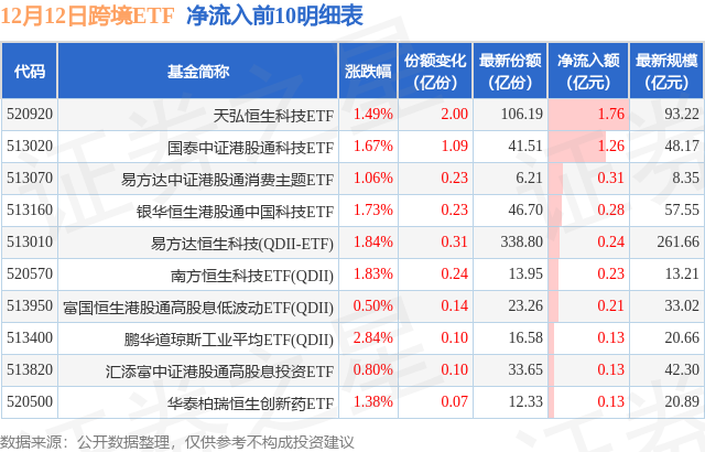 当日有38只跨境ETF基金出现资金净流入,其中净流入排首位的是天弘恒生科技ETF(520920),份额增加了2.0亿份,净流入额为1.76亿元。
