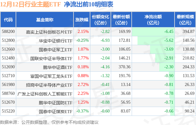 当日有128只行业主题ETF基金出现资金净流出,其中净流出排首位的是嘉实上证科创板芯片ETF(588200),份额减少了2.82亿份,净流出额为6.45亿元。