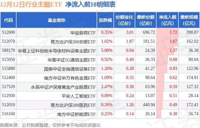 当日有58只行业主题ETF基金出现资金净流入,其中净流入排首位的是华宝券商ETF(512000),份额增加了3.01亿份,净流入额为1.72亿元。