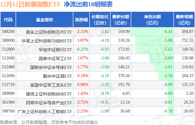 当日有190只股票指数ETF基金出现资金净流出,其中净流出排首位的是嘉实上证科创板芯片ETF(588200),份额减少了2.82亿份,净流出额为6.45亿元。