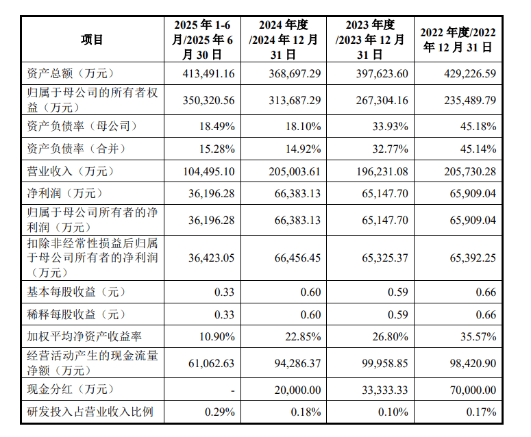 报告期内(2022年至2025年上半年),马矿股份的营业收入分别为20.57亿元、19.62亿元、20.5亿元、10.45亿元;净利润分别为6.59亿元、6.51亿元、6.64亿元、3.62亿元。