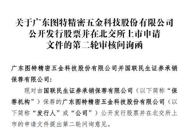乐居财经 李兰12月12日,广东图特精密五金科技股份有限公司(以下简称:图特股份)披露北交所上市第二轮审核问询函,保荐机构为国联民生证券承销保荐有限公司,会计师事务所为广东司农会计师事务所(特殊普通合伙)。