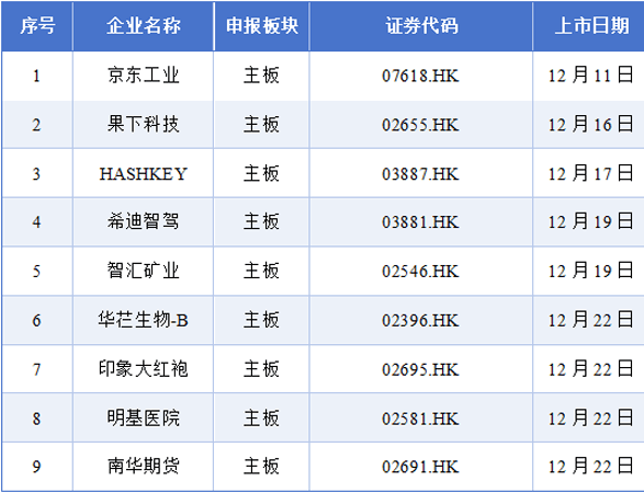 12月7日至12月13日间,京东工业、果下科技、HASHKEY、希迪智驾、智汇矿业、华芢生物-B、印象大红袍、明基医院、南华期货启动招股程序,其中,京东工业、果下科技、HASHKEY已完成招股。