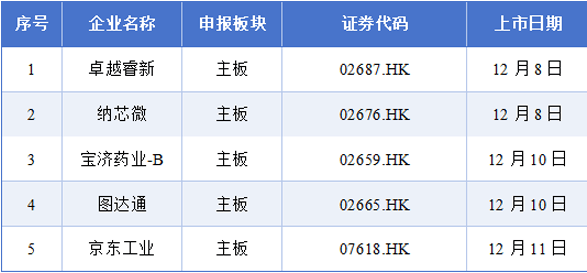 12月7日至12月13日期间,卓越睿新、纳芯微、宝济药业-B、图达通、京东工业挂牌上市。