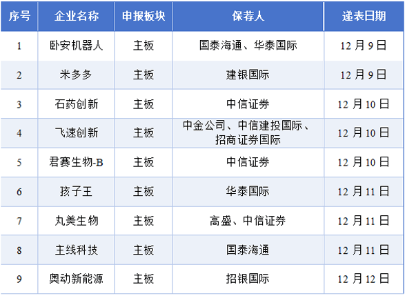 12月7日至12月13日期间卧安机器人、米多多、石药创新、飞速创新、君赛生物-B、孩子王、丸美生物、主线科技、奥动新能源向港交所递交上市申请,其中石药创新、孩子王、丸美生物已登陆A股,此次冲击“A+H”两地上市。