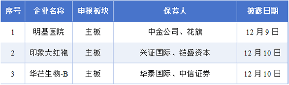 12月7日至12月13日期间,明基医院、印象大红袍、华芢生物-B共3家公司通过聆讯。