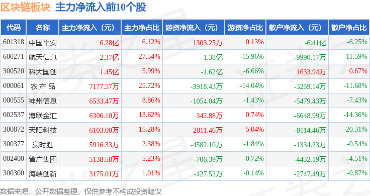 从资金流向上来看,当日区块链板块主力资金净流出40.77亿元,游资资金净流入5.39亿元,散户资金净流入35.38亿元。区块链板块个股资金流向见下表: