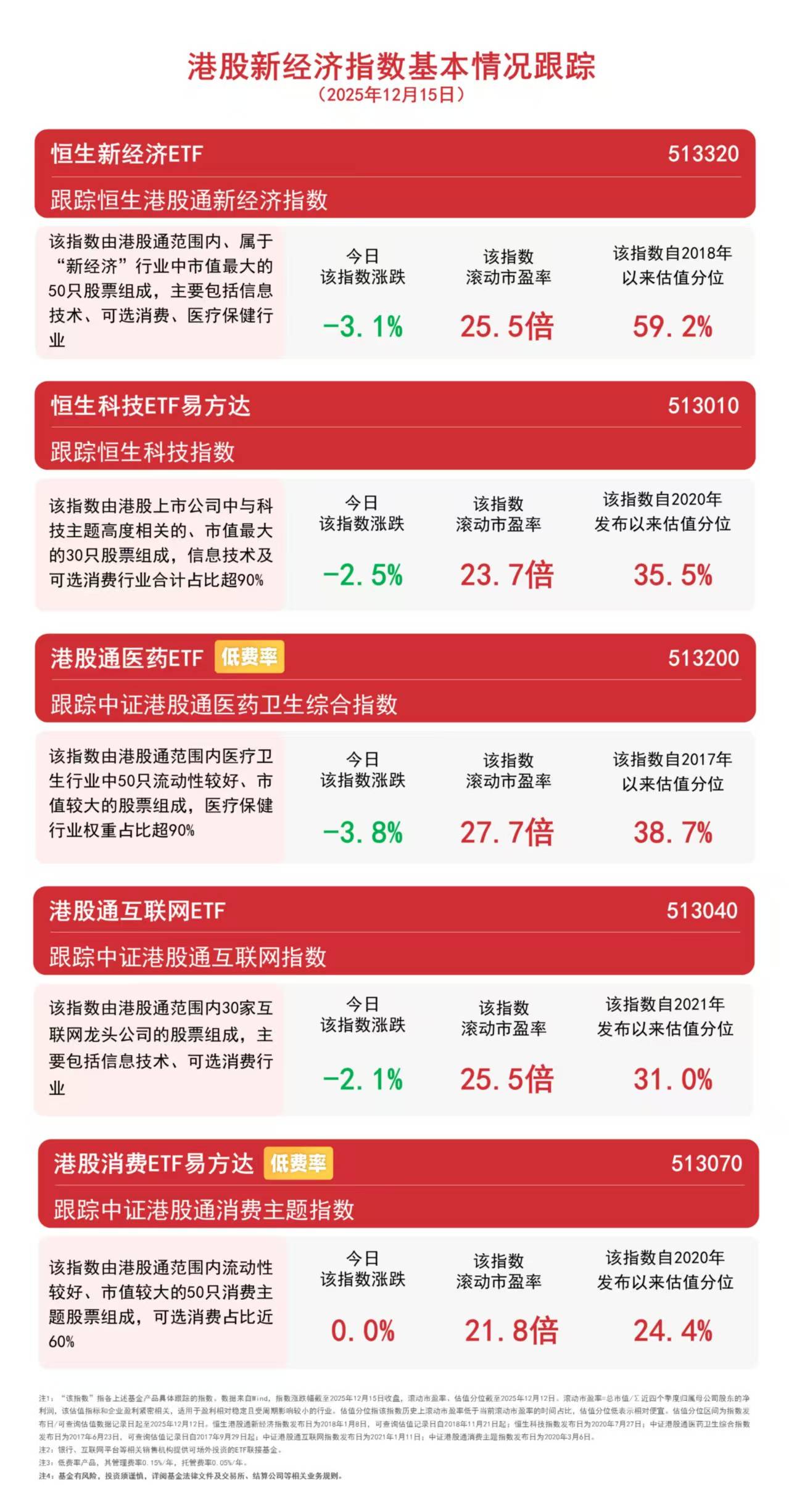 港股今日全线回调,消费板块相对稳健。指数层面,中证港股通消费主题指数上涨0.04%,中证港股通互联网指数下跌2.1%,恒生科技指数下跌2.5%,恒生港股通新经济指数下跌3.1%,中证港股通医药卫生综合指数下跌3.8%。相关产品受资金关注,Wind数据显示,恒生科技ETF易方达(513010)和港股通互联网ETF(513040)上周分别获5.6亿元和4.5亿元资金净流入。