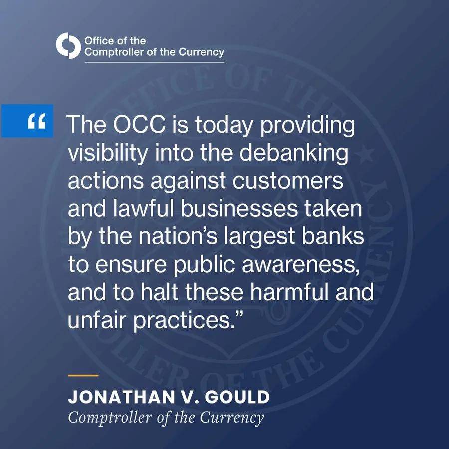 它们并非直接拒绝,而是通过设立极高的“升级审查”门槛,使得这些企业实际上无法获得正常的金融服务。OCC署长Jonathan Gould措辞严厉地指出,银行利用其政府授予的特许经营权和市场力量来推动这些有害的“去银行化”政策是“不恰当的”。他暗示,OCC可能会将调查结果提交给司法部,追究潜在的违法行为。