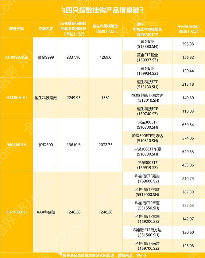 在这一轮扩容浪潮中,挂钩科创债、沪深300、黄金及恒生科技指数的四类ETF表现尤为突出,年内规模增长均超过1000亿元,成为结构性行情中的典型代表。
