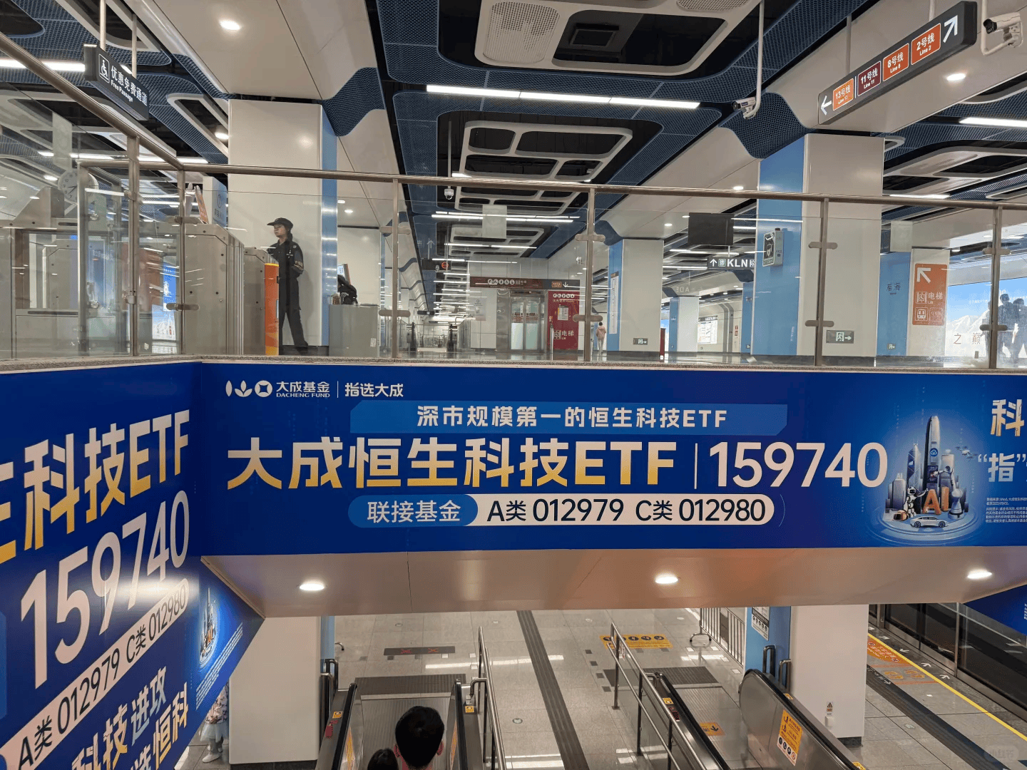 近日,深圳地铁扶梯上方的一张大海报,在社交平台上引起了广泛讨论。海报主要宣传的产品是“大成恒生科技ETF”,并且醒目地标注场内交易代码和联接基金代码,并强调“深市规模第一”等卖点。