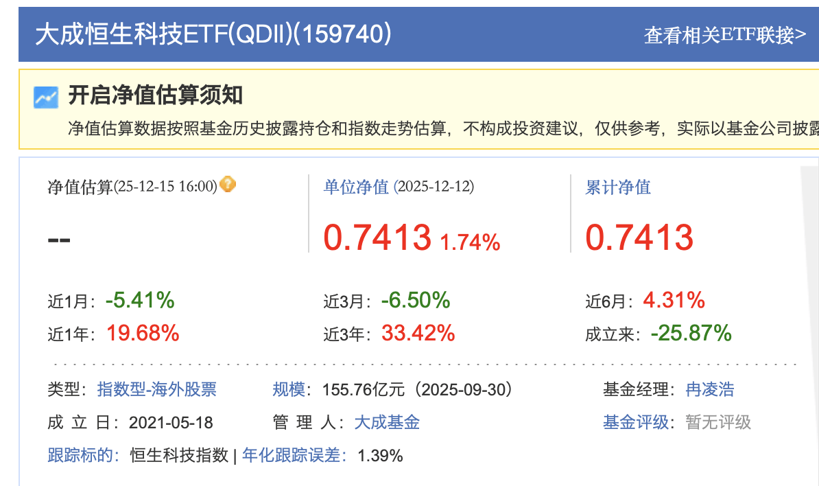 与规模形成强烈对比的是该基金不尽人意的业绩表现,大成恒生科技ETF成立以来亏损超四分之一,收益率-25.87%,大成恒生科技ETF联接A近三个月收益率为-6.50%,近一个月为-5.41%,与恒生科技指数近期的调整同步。其中有不少在三季度进场的新投资者,正面临四季度行情回落的冲击,成为业绩亏损的主要承压群体。