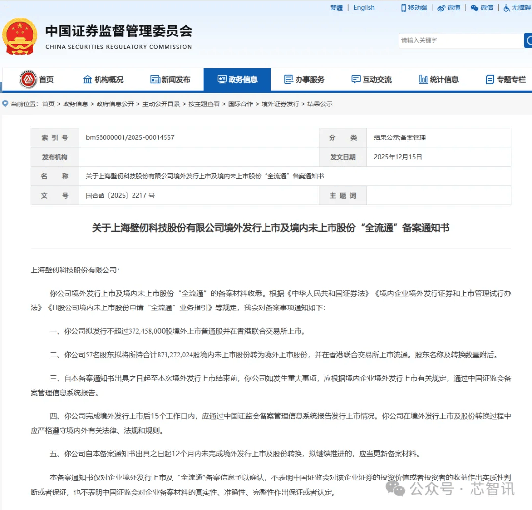 12月15日消息,中国证监会国际合作司发布了关于上海壁仞科技股份有限公司(以下简称“壁仞科技”)境外发行上市及境内未上市股份“全流通”备案通知书。