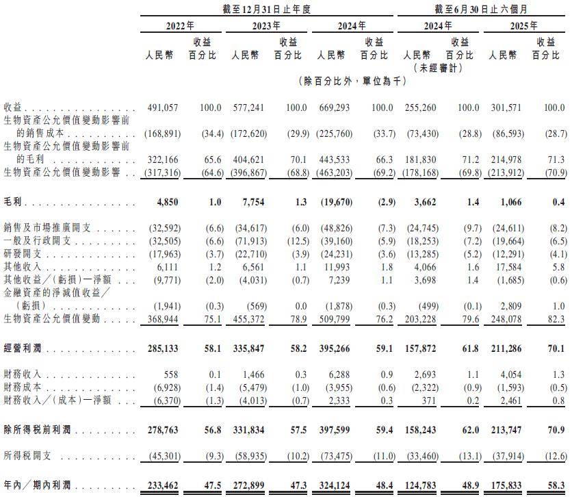 据招股书显示,在计入生物资产公允价值变动影响前,鲟龙科技2022年至2025年上半年的毛利率介于65.6%至71.3%之间,表现强劲。但若扣除生物资产公允价值变动的影响,同期毛利率则骤降至-2.9%至1.3%的区间,2024年甚至为负值。