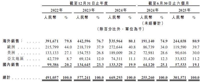 其一,海外市场依赖症是悬顶之剑。2022年至2025年上半年,鲟龙科技海外销售占比始终高于76%,2025年上半年高达80.9%,其中欧美市场是关键,地缘政治与贸易政策风险敞口巨大。