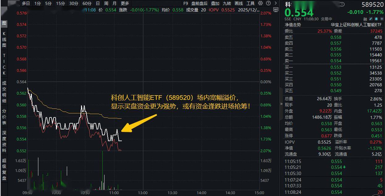 盘面上,12月16日早盘,重仓端侧AI的——科创人工智能ETF(589520)随市回调,场内价格现跌1.77%,该ETF场内宽幅溢价,显示买盘资金更为强势,或有资金逢跌进场抢筹!事实上,该ETF昨天单日吸金511万元。