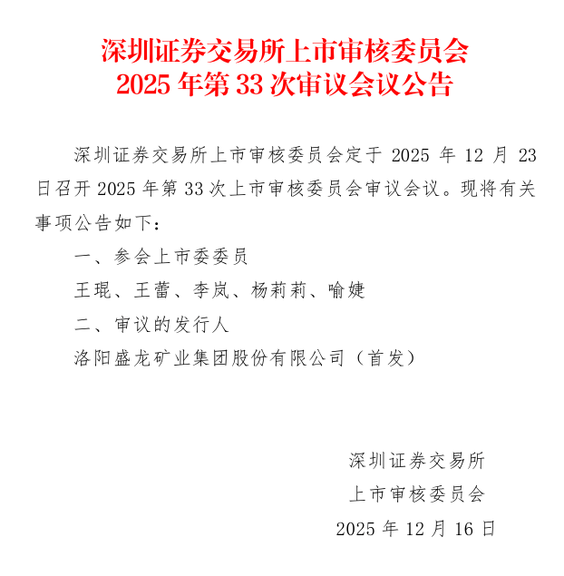 【大河财立方 记者 陈玉尧】12月16日,深交所公告,定于2025年12月23日召开2025年第33次上市审核委员会审议会议,审议洛阳盛龙矿业集团股份有限公司首发事项。