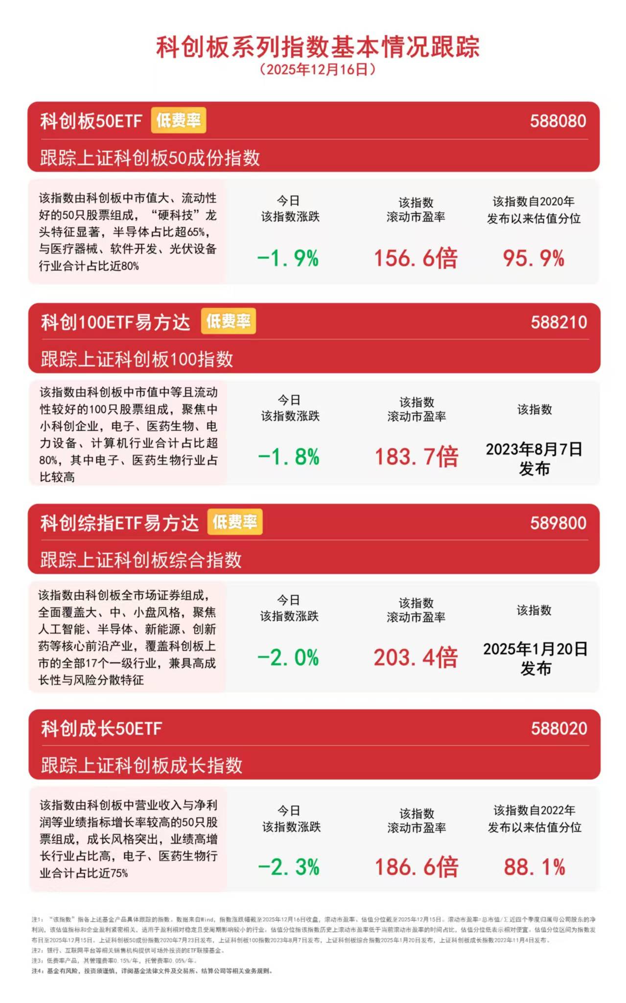 今日市场调整,弹性较高的科创板块相对承压。截至收盘,科创100指数下跌1.8%,科创板50指数下跌1.9%,科创综指下跌2.0%,科创成长指数下跌2.3%。