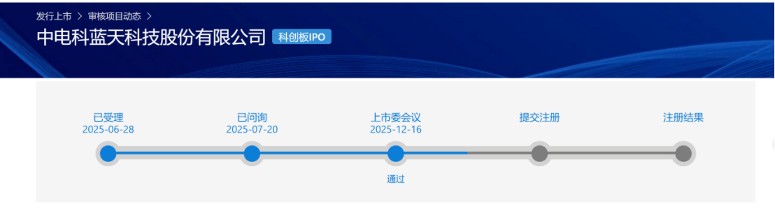 12月16日,上海证券交易所上市审核委员会召开2025年第65次审议会议。审议结果显示,中电科蓝天科技股份有限公司符合发行条件、上市条件和信息披露要求,拟登陆科创板。