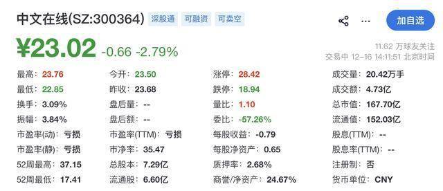 截至发稿时,中文在线A股报23.02元,跌2.79%,总市值约167.7亿元。
