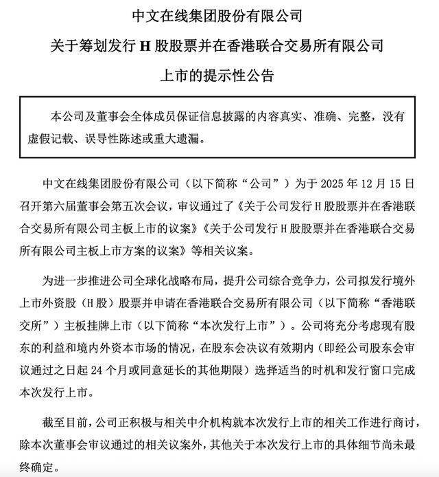 瑞财经 吴文婷12月15日,中文在线发布公告称,公司为于2025年12月15日召开第六届董事会第五次会议,审议通过了《关于公司发行H股股票并在香港联合交易所有限公司主板上市的议案》《关于公司发行H股股票并在香港联合交易所有限公司主板上市方案的议案》等相关议案。