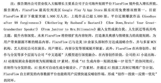 关于业绩变动,中文在线表示,报告期内公司营业收入大幅增长主要系公司子公司海外短剧平台FlareFlow境外收入增长所致。