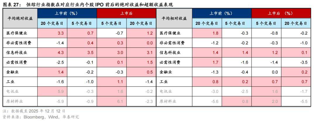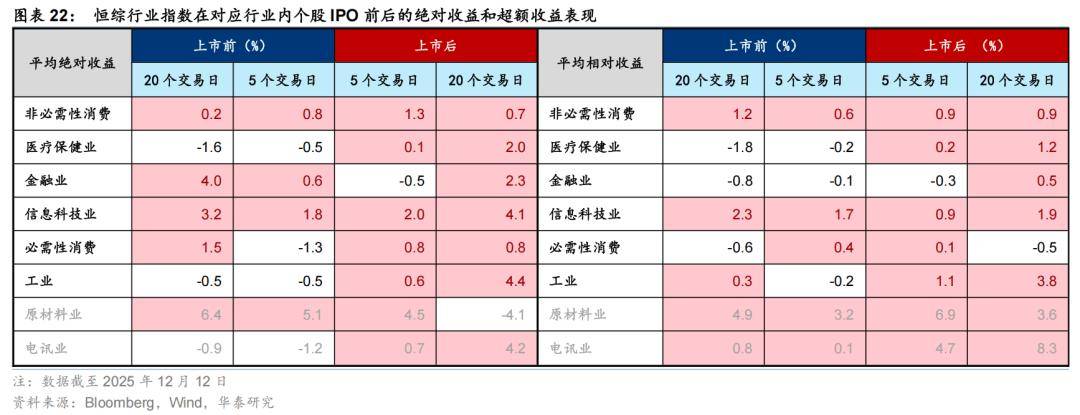 行业层面,行业内大型IPO对可选消费及信息科技或有一定的提振效果,两者在行业内IPO前后的平均绝对收益和超额收益均为正,医疗保健、工业在IPO后也有较好的表现。从前后5个交易日和20个交易日的平均的绝对收益上看,可选消费及信息科技在行业内IPO的前后的平均绝对收益均为正。医疗保健以及工业在IPO后平均绝对收益由负转正。平均相对收益上看,可选消费、信息科技和医疗保健行业的前述规律同样成立。电讯、原材料的样本数量不足5家,故不作探讨。