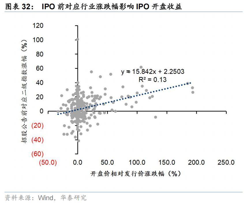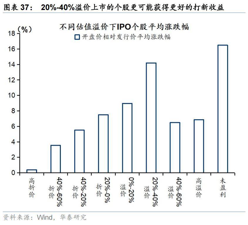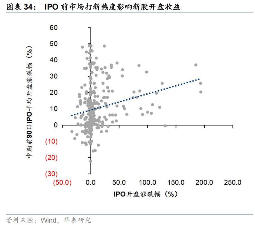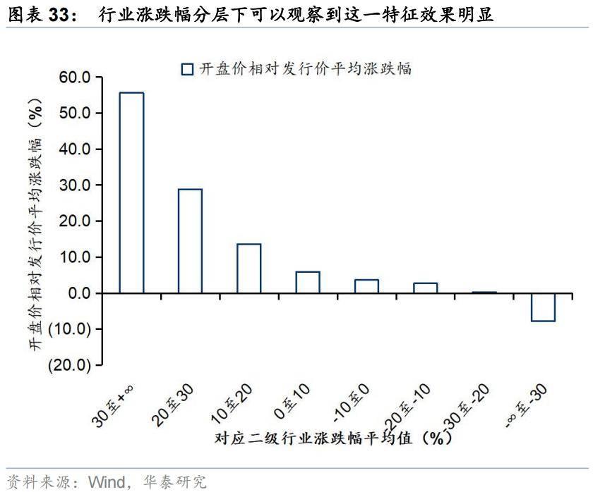 同样的,当近期新股打新平均收益更高时,后续的IPO项目可能获得更好的开盘表现。当近期新股开盘平均收益率位于20%-30%时,后续IPO项目可以获得平均24%的收益。但收益率过高的打新收益也可能是拐点的信号,因此当近期新股开盘平均收益率超过30%时,后续IPO项目的平均收益反而有所下降(图35)。