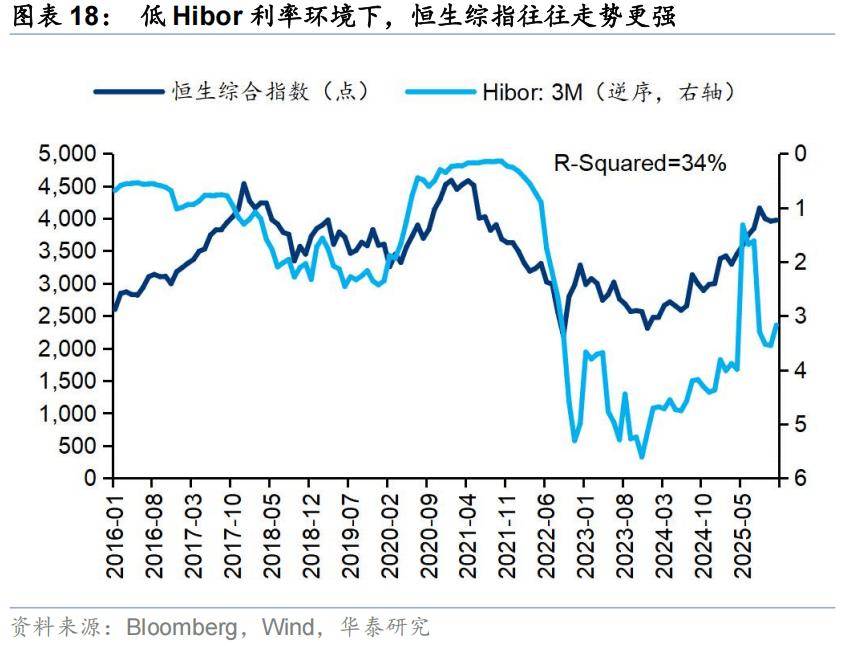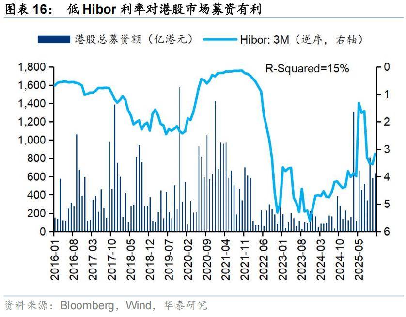 一级市场融资的活跃程度与二级市场的表现成弱正相关而非负相关。一方面,两者可能互为因果。企业倾向于在二级市场表现好的时候递表,同时,重磅IPO往往吸引更多投资者参与港股市场的交易。另一方面,两者背后可能有共性的宏观驱动因素,弱美元与低Hibor利率的环境下,两者往往同步走强。由于Hibor利率直接受港美汇率影响,美元是更重要的变量。一二级市场表现同步正相关带来的一个结果是,港股IPO融资相对二级市场市值及成交额的规模通常不大,使得“抽水效应”通常有限。