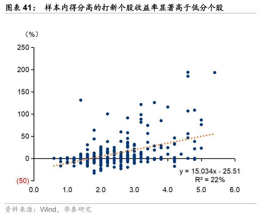 考虑到可能存在的过度拟合影响,我们选择样本外数据对模型效果进行检验,发现指标仍保持了较高的有效性。样本外,IPO打分大于2.5的标的平均收益率达41.7%(未筛选时为14.8%),得分高的个股收益率同样较高。