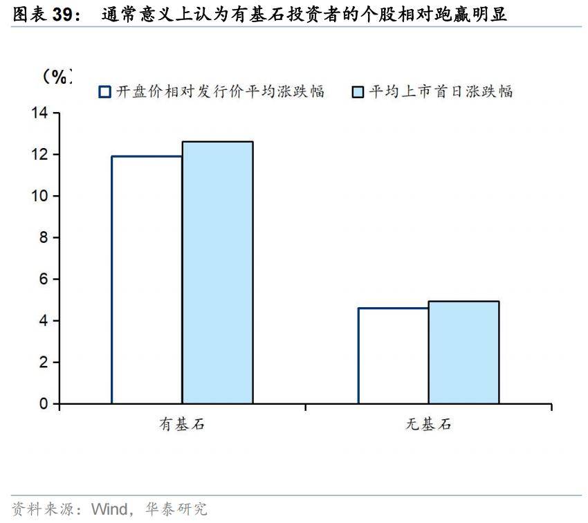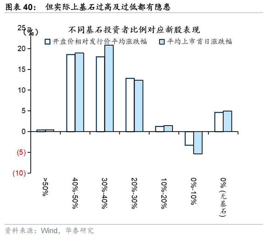 3)基石投资者方面,通常认为有基石投资者的新发个股表现相对更优,但基石投资者比例过高或同样存在隐忧。统计来看,有基石投资者参与的个股开盘涨跌幅均值在12%左右,显著高于无基石投资者的个股均值(4.6%),但基石投资者比例过高,例如超过50%时,新发个股表现显著走弱,较为理想的基石投资者比例在20%-50%。