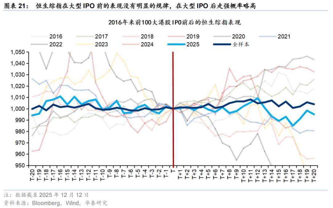 考虑到大型IPO的关注度通常更高,对市场的短期冲击理论上更大,我们评估时以2016年1月至2025年12月12日(以上市日期统计)期间的前100大IPO(实际募资额口径)为样本,最小募资规模约30亿港元。