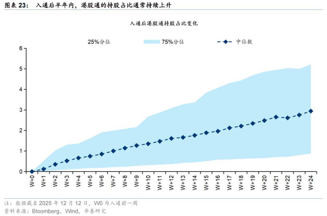 入通后半年内,南向资金的持股占比通常持续上升,成为重要的增量资金来源。历史上看,在入通后,南向资金会在较长的一段时间窗口内持续增配,半年后的持股占比中位数近3%。无论持股占比持续上升的背后是南向以较其他投资者更高的斜率增配或是南向承接其他投资者进行增配,都意味着南向资金能够作为增量资金的来源。