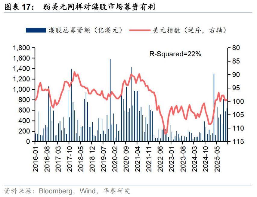 弱美元和低Hibor可能是驱动两者同步走强的共性因素。第一,美元指数是全球流动性分配的锚,弱美元环境下,投资者往往会减配美国资产而增配全球其他市场的资产,港股是潜在选项之一,外资主要通过在二级市场交易来增配港股,以基石投资者的方式认购则是另一种途径,投资者参与度高往往会提升IPO募资的积极性。第二,低Hibor利率有利于二级市场“拔估值”的同时,低借贷成本也可能提升IPO融资的积极性。当然,需要指出的是由于Hibor利率的变化一定程度上与港美汇率有关,因此两者本身通常同步发生,美元指数的影响更大。今年5月是典型案例,美元兑港元触及7.75的强方兑换保证水平,香港金管局抛售港元,买入美元,使得3个月Hibor利率大幅下行。对应地,今年5月IPO募资规模由4月的约30亿港元提升至超550亿港元,5月恒生综指涨约5%。