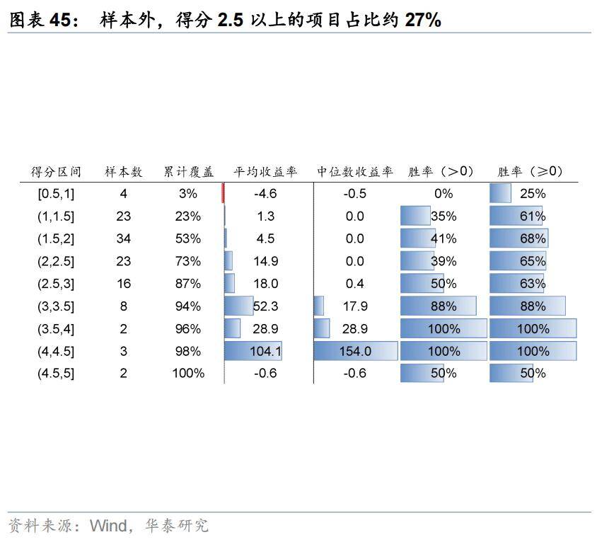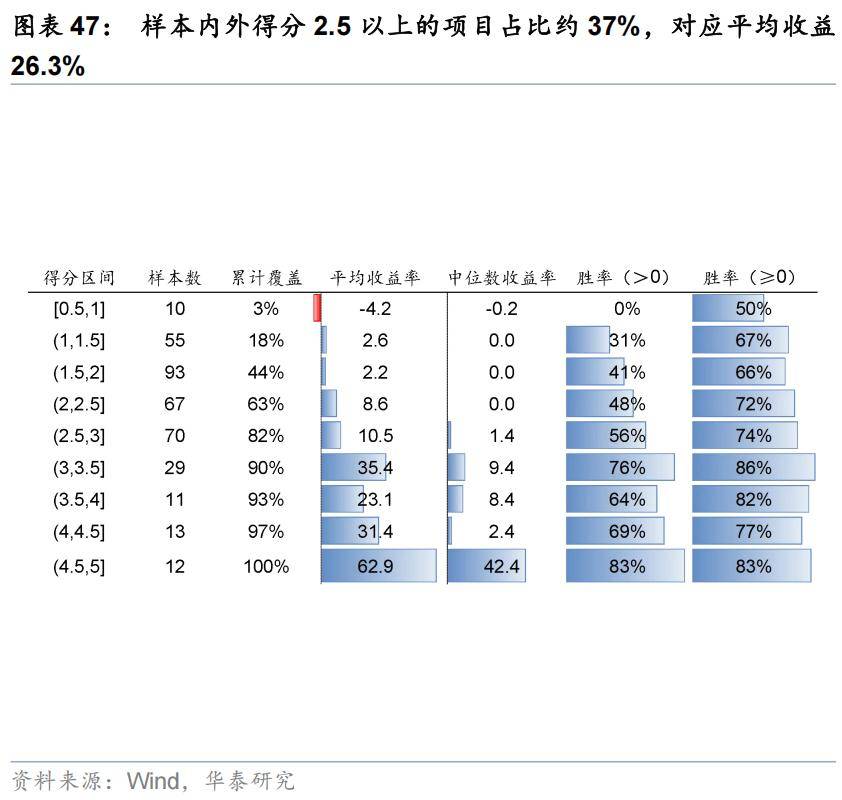 参与得分较高的个股可显著提升打新的赔率及胜率。样本内外结合来看,若不进行筛选,则上市开盘收益为11.8%,破发率约50%(开盘价小于等于发行价)。对比来看,若仅参与得分2.5以上的个股(即参与37%的项目),开盘收益可以提升至26.3%,破发率降低至32%。若打新范围进一步缩窄,仅参与3分以上的项目(参与18%),则开盘收益可以提升至44.2%,破发率降低至23%。