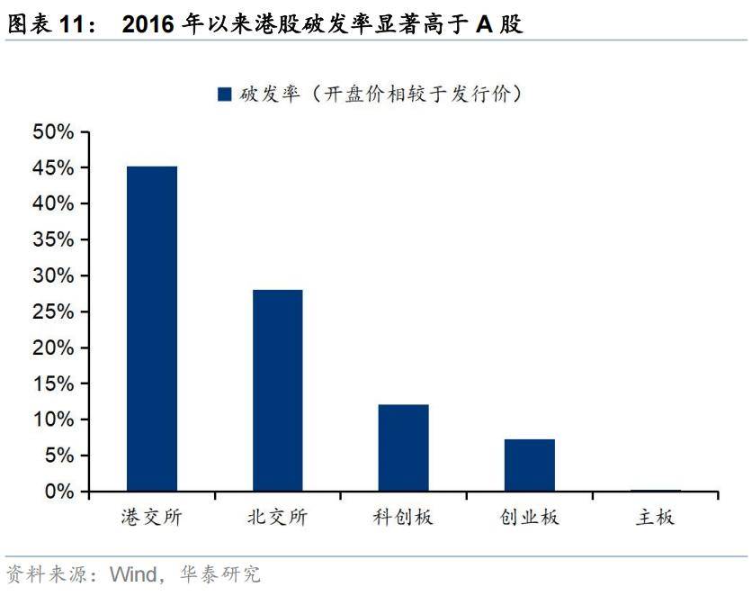 受港股发行定价机制的影响,港股新股上市后的涨跌分布相对均匀。2016年以来,港股平均破发率在45%,显著高于A股水平,A股主板破发率甚至低至0.2%。
