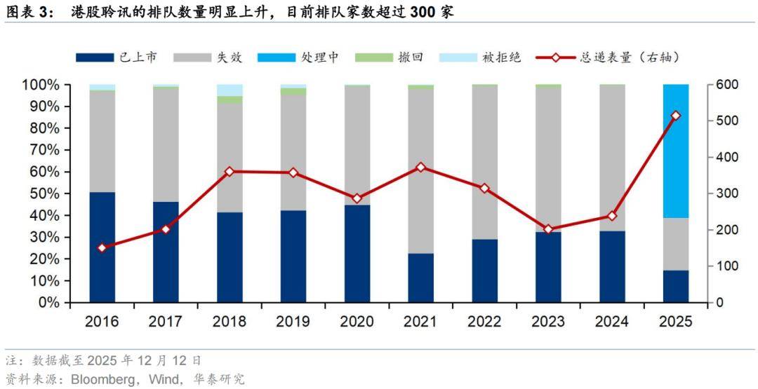 港股上市为注册制,但并不意味着一定可以如期上市。2016年来港交所IPO的上市成功率为37%(当年上市数/剔除处理中家数后的当年总递表数),低于同期A股上市成功率89%(以审核通过家数统计)。截至2025年12月12日,港股2025年递表并上市的企业仅76家,失效124家,上市成功率为35%,尚在上市处理流程中项目314个,平均排队时长81天,最长排队时长182天。这些项目很难全部在明年成功上市。