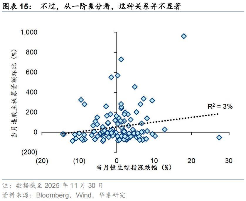 月频数据看,港股一级市场的融资与同期的恒生综指表现正相关,两者更可能是互为因果。从2016年1月至2025年11月的月频数据看,两者确实存在一定的正相关关系。我们的理解是一方面,企业更倾向于在二级市场流动性充裕、估值水位偏高时递表申请IPO(我们在前述的年度数据上观察到了这种效应)。另一方面,IPO融资的活跃,尤其是一些优质的重磅IPO项目能够在一定程度上吸引更多投资者关注并参与港股市场的交易。但是两者的一阶差分(去趋势处理)之间的线性关系却并不显著。