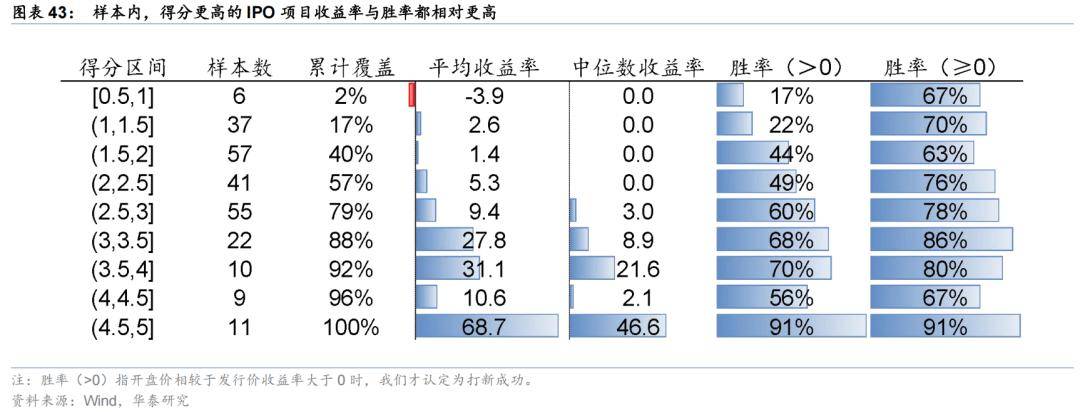 本章节我们只关注打新交易,不针对持有期限较长的基本面投资以及基石投资者。我们的出发点在于构建一套系统化指标以对所有IPO项目进行筛选,挑选出潜在破发率更低、收益空间更大的IPO项目,但并不对公司质量等进行逐一分析。若选取得分中值(2.5分)以上的标的参与,可以相较于不进行筛选时提高约15pct的收益水平,且伴随着评分的提高,打新的胜率及赔率均在显著提升。
