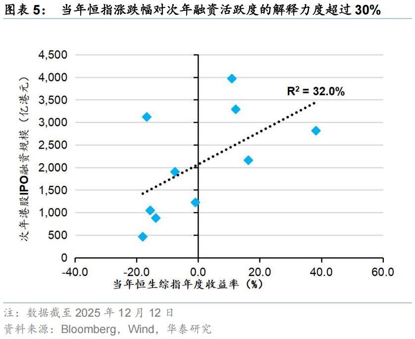 前瞻性的看,2026年港股市场的IPO融资可能仍将较为活跃。第一,截至2025年12月12日,港股已递表处理中的上市申请共有314家,项目储备丰富。第二,年度维度看,通常前一年二级市场的表现会影响上市公司的递表决策。年初至12月12日,恒生综指整体表现亮眼,涨幅超30%,同样指引明年港股主板的IPO融资热度有望维持高位。