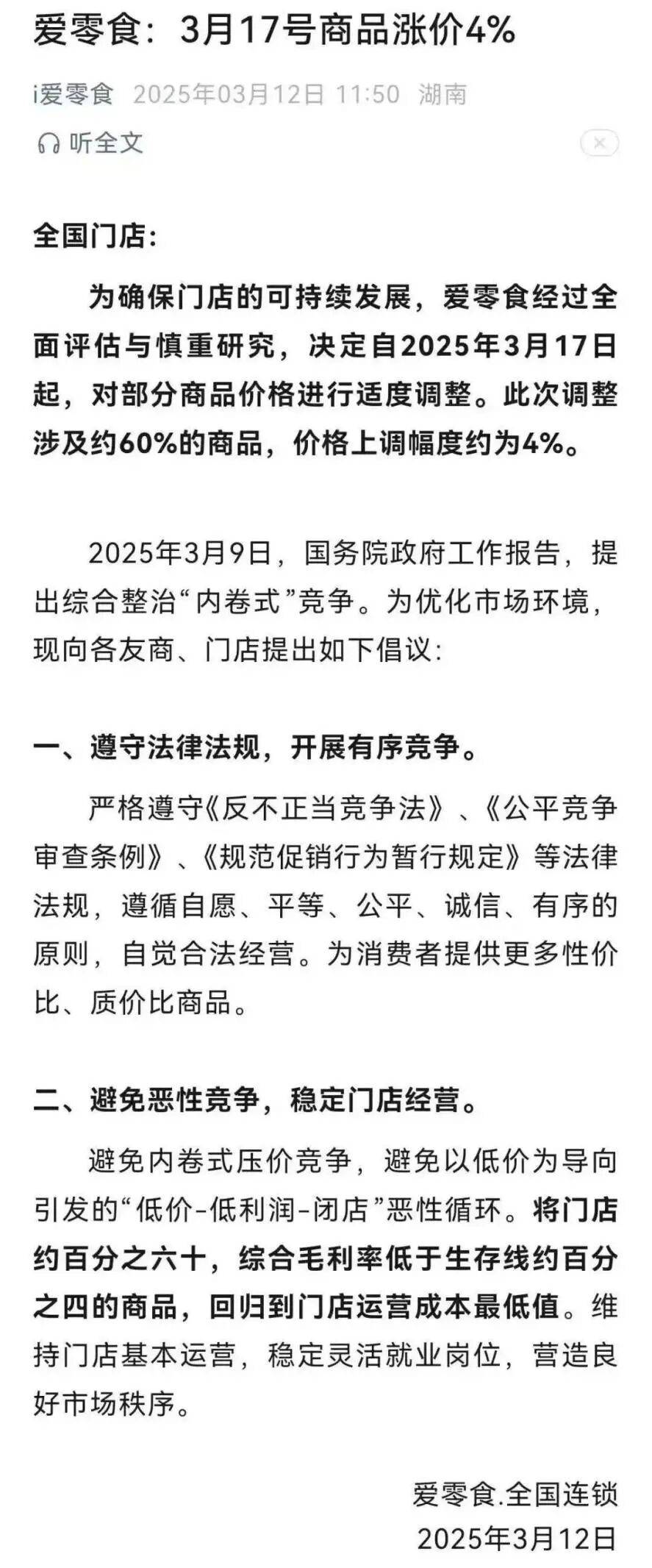在今年3月12日,爱零食公众号就发布过“涨价通知”,但仅几小时后就没了,而在此之前,唐光亮在社交媒体上呼吁头部品牌们放弃价格竞争,一起提升门店定价及毛利率的视频,也同样不见了。