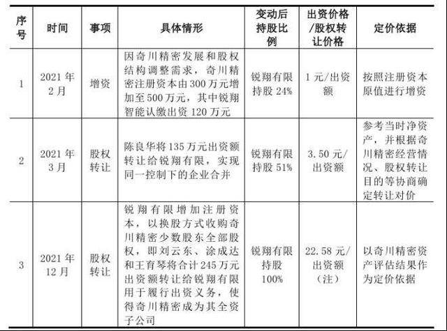 2021年12月,锐翔有限增资873.02万元,以换股方式收购奇川精密少数股东全部股权,即刘云东、涂成达和王育琴将合计245万元出资额转让给锐翔有限用于履行出资义务,转让价格为22.58元/出资额。此次转让以奇川精密资产评估结果作为定价依据。此次交易后,奇川精密成为锐翔有限全资子公司 。