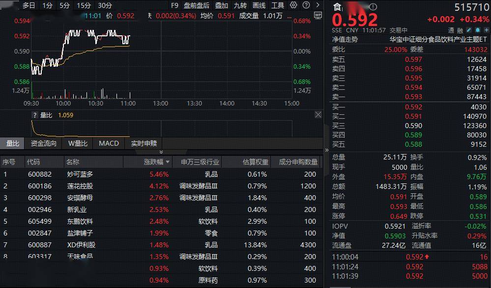 成份股方面,大众品涨幅居前,截至发稿,妙可蓝多大涨超5%,莲花控股涨超4%,安琪酵母、新乳业、东鹏饮料等多股涨超2%。
