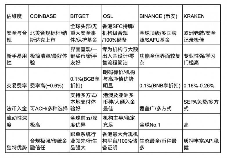 绝对新手,追求极致简单与合规:首选 Coinbase,但其费率最高。