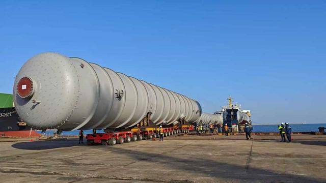 据悉,此次承运的设备是惠州三期乙烯项目装置的核心组成部分,涵盖抽提蒸馏塔、溶剂回收塔、脱重塔三套巨型塔器。其中,单体设备最大直径近7米、最长超80米,最大重量更是达到318.7吨,堪称“巨无霸”级装备。这类超高、超重、超限的大件设备,对装卸作业的精度控制、现场稳定性以及海上航行安全都提出了严苛挑战。