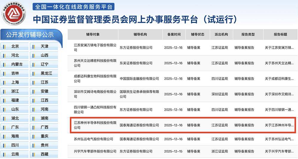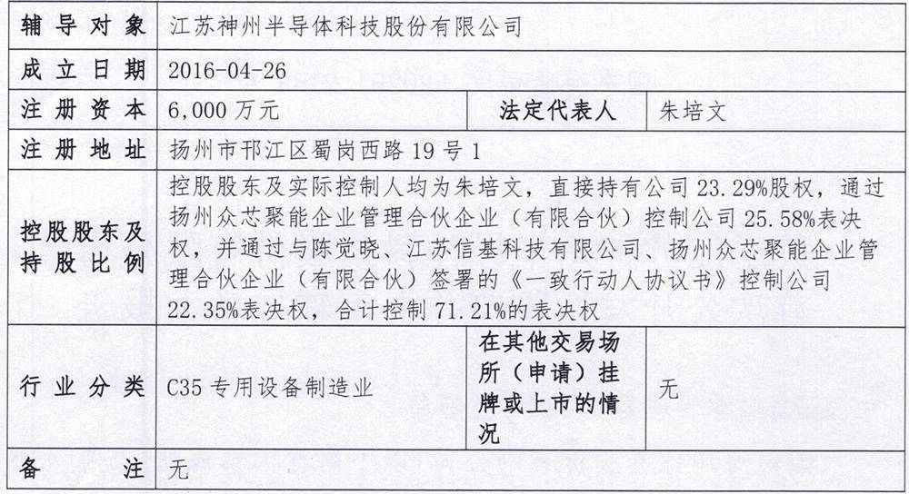 芯东西12月17日报道,12月16日,证监会官网披露,江苏扬州半导体设备公司神州半导体科技在江苏证监局办理上市辅导备案登记,启动A股IPO进程,辅导机构为国泰海通。