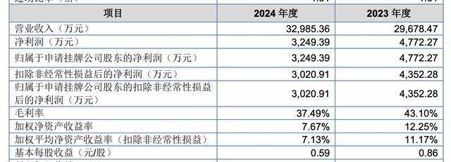 2023年、2024年,森泰英格营业收入分别为2.97亿元、3.3亿元;净利润4772.27万元、3249.39 万元;毛利率分别为43.1%、37.49%。