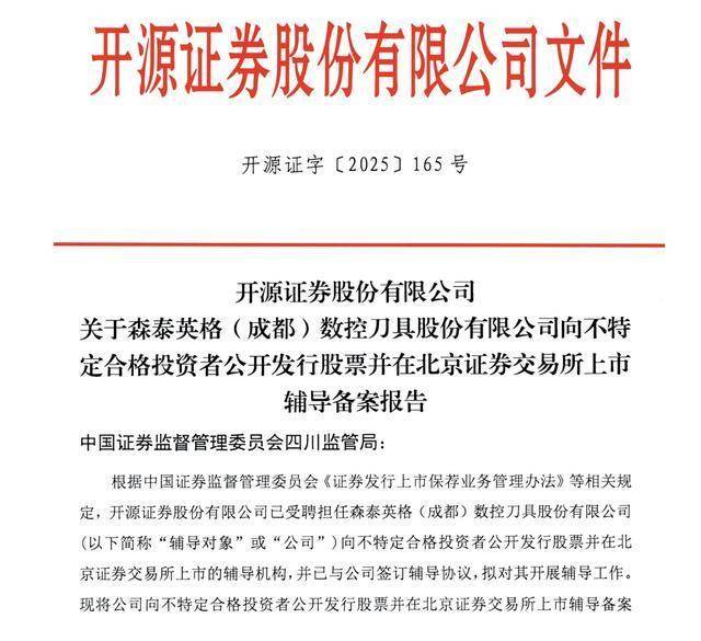 瑞财经 刘治颖 12月17日,森泰英格(成都)数控刀具股份有限公司(以下简称:森泰英格)在四川证监局完成IPO辅导备案,拟北交所上市,辅导机构为开源证券。