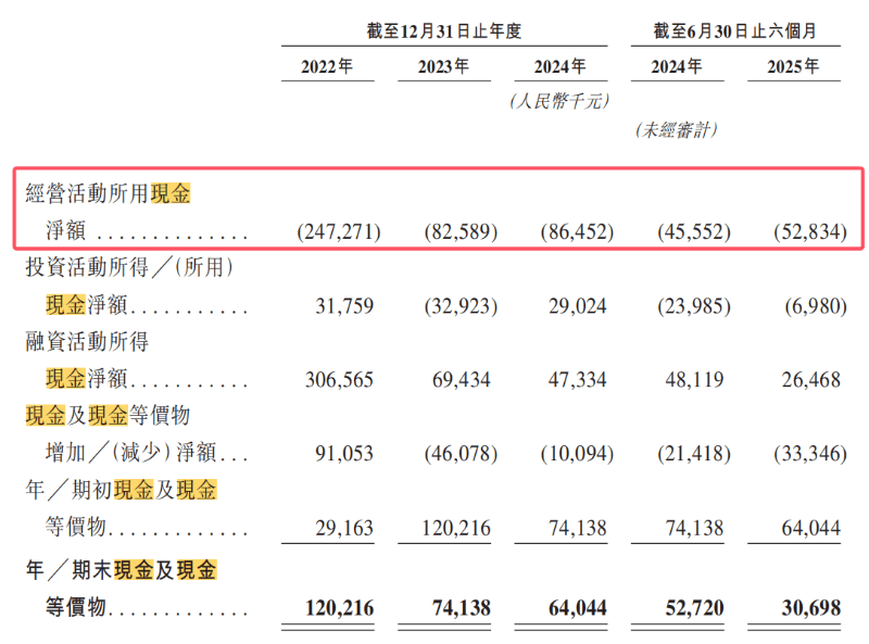 2022年至2024年以及2025年1-6月份,主线科技的经营性现金流始终为负,各期分别为-2.47亿元、-8258.9万元、-8645.2万元和-5283.4万元,累计净流出4.69亿元。