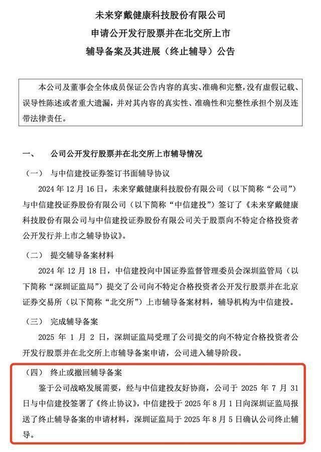 鉴于公司战略发展需要,经与中信建投友好协商,公司于2025年7月31日与中信建投签署了《终止协议》,中信建投于2025年8月1日向深圳证监局报送了终止辅导备案的申请材料,深圳证监局于2025年8月5日确认公司终止辅导。
